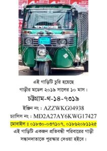 চট্টগ্রামের পটিয়ায় রাতের আঁধারে প্রতিবন্ধীর বাড়ি থেকে তাঁর জীবিকা নির্বাহের একমাত্র অবলম্বন একটি সিএনজি অটোরিকশা চুরি করে নিয়ে গিয়েছে চোরেরা। চুরি হওয়া ওই গাড়িটির নাম্বার চট্টগ্রাম-থ-১৪-৭৩১৯, ইঞ্জিন নং: AZZWKG04938, চ্যাসিস নং: MD2A27AY6KWG17427।